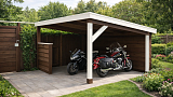 Участок возле собственного дома, дачи или любого другого частного домостроения не обходится без малых архитектурных форм. Удачным приобретением станет деревянный навес для мотоцикла. Компактная, но надёжная конструкция может быть выполнена как полностью автономным сооружением с классическими архитектурными формами, так и в виде пристройки к дому или хозяйственной постройке. Продуманное решение изящно впишется в планировку любого дачного или загородного участка, не загромождая пространство. Деревянный навес послужит отличным парковочным местом для одного или нескольких мотоциклов, освобождая полезное пространство в гараже или сарае. Для производства всех элементов используется только отборная древесина без малейших дефектов, прошедшая камерную сушку и глубокую пропитку антисептиками. Такому навесу не страшны высокая влажность и перепады температур - можно быть уверенным, что дерево не растрескается, не разбухнет и не покоробится даже спустя годы активной эксплуатации.