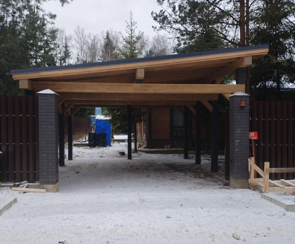 Конструкция — без хозблока, вся площадь предназначена исключительно для парковки и обслуживания транспорта. Односкатная крыша быстро отводит осадки, снижает снеговую нагрузку и делает монтаж экономичнее по сравнению с классическими двускатными вариантами.