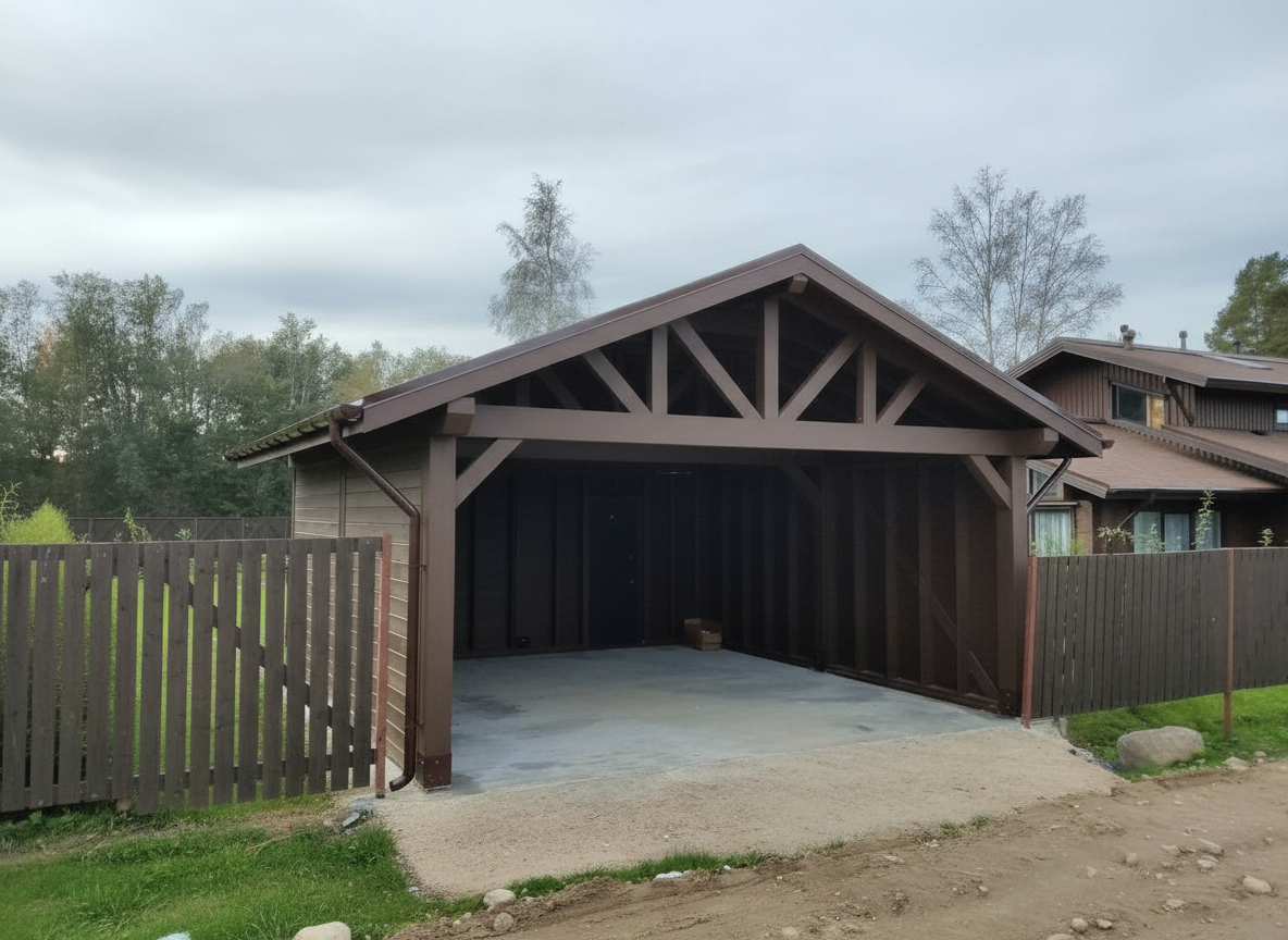 Двухскатный навес ВИЛЬЯМ габаритами 8×7 метров с интегрированным хозяйственным блоком создает пространство для одновременной парковки двух автомобилей и организации функциональной зоны хранения. Архитектурное решение с классической двускатной кровлей обеспечивает естественный сток осадков, предотвращая скопление снега и воды на поверхности. Основа конструкции сформирована из высококачественного хвойного массива камерной сушки, прошедшего специальную обработку для минимизации усадки и деформации в процессе эксплуатации. Несущие стойки выполнены из бруса 190×240 мм, обеспечивающего повышенную устойчивость к ветровым нагрузкам и гарантирующего долговечность сооружения. Наружная отделка хозблока представлена профилированной имитацией бруса 21 мм с замковым соединением шип-паз, исключающим образование щелей и обеспечивающим надежную защиту от внешних воздействий. Внутреннее пространство хозблока обшито аналогичным материалом толщиной 16 мм, создавая комфортную зону для хранения инвентаря. Кровельное покрытие из финской гибкой черепицы Shinglas коллекции "Соната" обладает высокой эластичностью и устойчивостью к перепадам температур, сохраняя свои свойства в экстремальных климатических условиях. Все деревянные элементы обработаны защитными составами, препятствующими гниению, воздействию ультрафиолета и атаке насекомых. В комплектацию входят металлическая дверь повышенной прочности и деревянное окно с одинарным остеклением, обеспечивающее естественное освещение внутреннего помещения. Дополнительные опции включают выбор альтернативных кровельных материалов, установку на различные типы оснований и нанесение защитной пропитки Tikkurila Ultra с сохранением качества на 7-10 лет. Качественная сборка и внимание к деталям делают навес ВИЛЬЯМ практичным и эстетичным дополнением к любому частному участку.