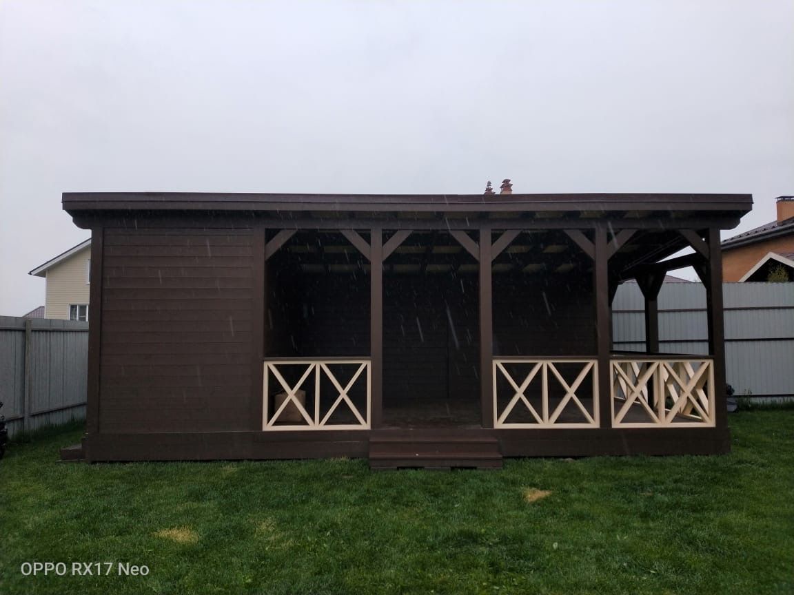 Открытая терраса. Классический вариант для дачного отдыха. Деревянный каркас, кровля, ограждение по периметру. Подходит для тёплого сезона.